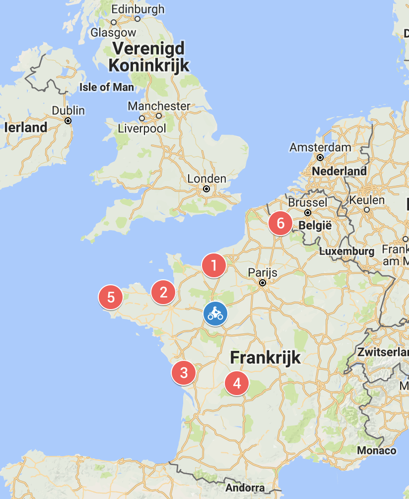Mogelijk vluchtbestemmingen, met afstand en tijd tot Le Mans: